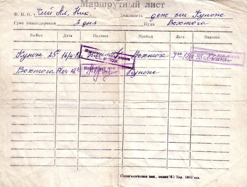 Маршрутный лист (1998 год).