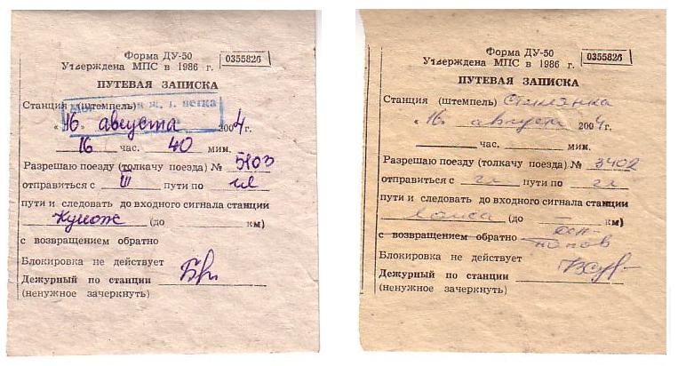 Путевые записки, дававшие право на занятие перегонов Ида - Кунож и Стеклянка - Ламса. Август 2004 г.