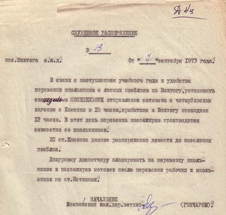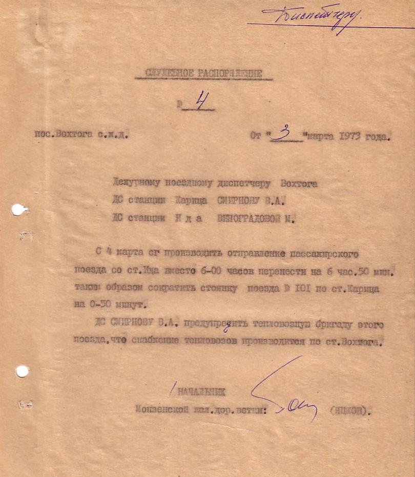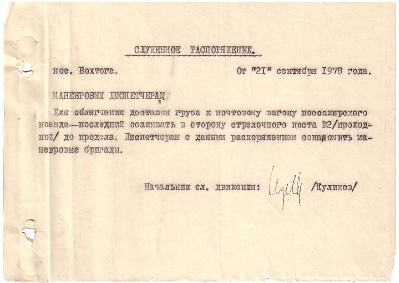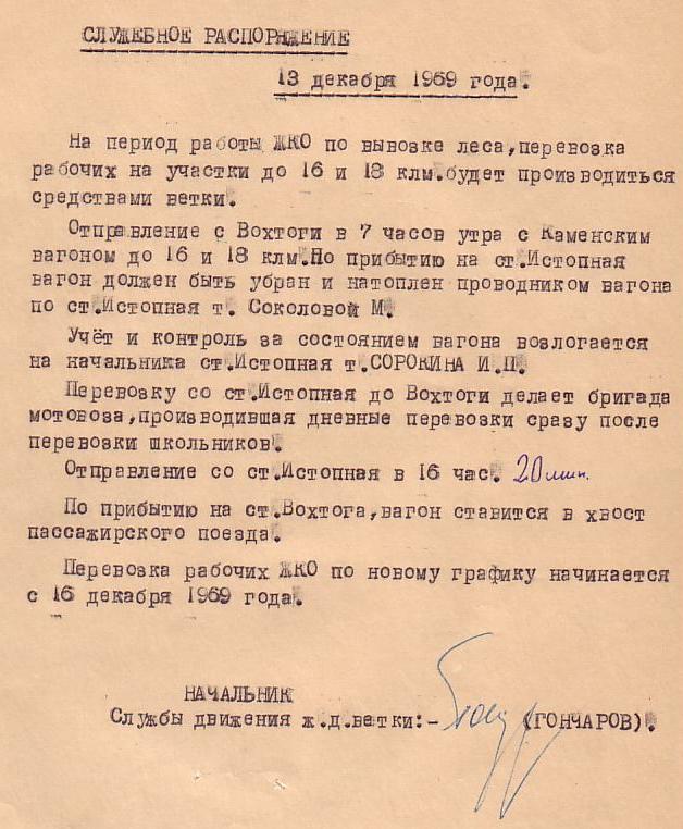 Служебное распоряжение от 13 декабря 1969 года (о перевозке рабочих ЖКО).