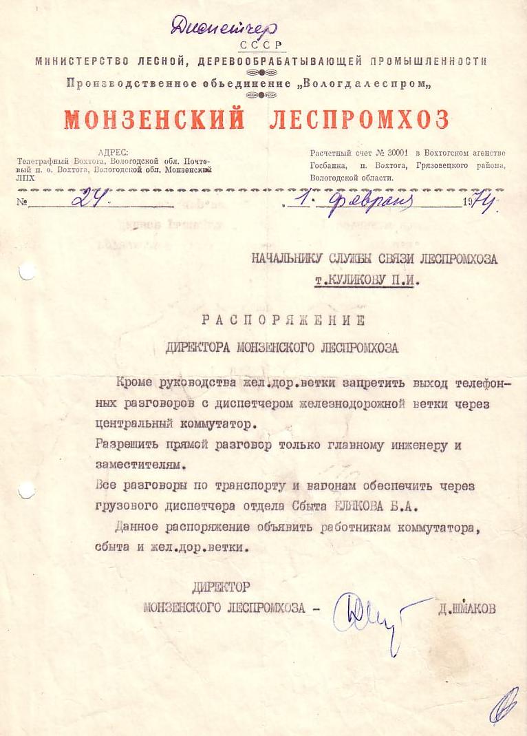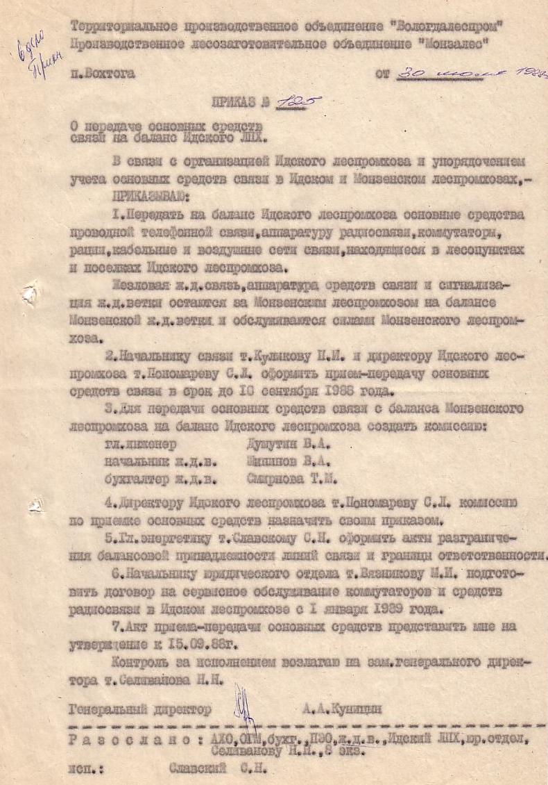 Приказ от 30 июля 1988 года (о передаче основных средств связи на баланс Идского леспромхоза).