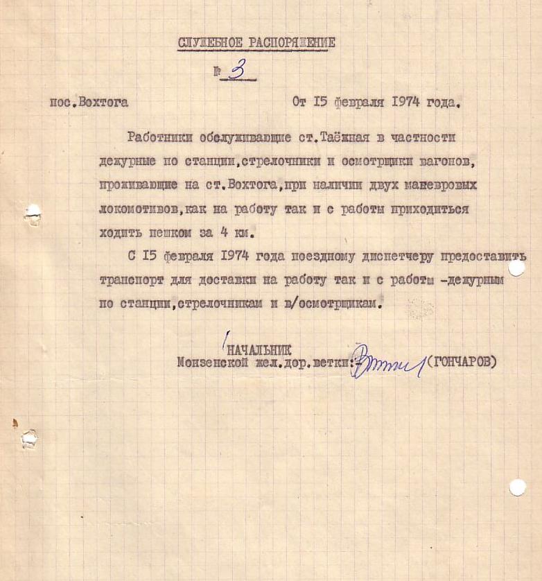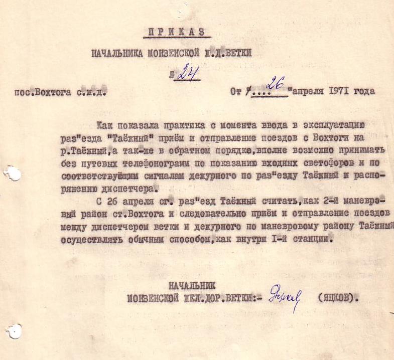 Приказ от 26 апреля 1971 года (об объединении разъезда Таёжный со станцией Вохтога).