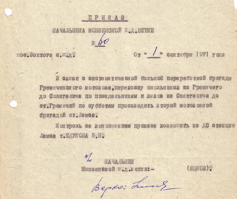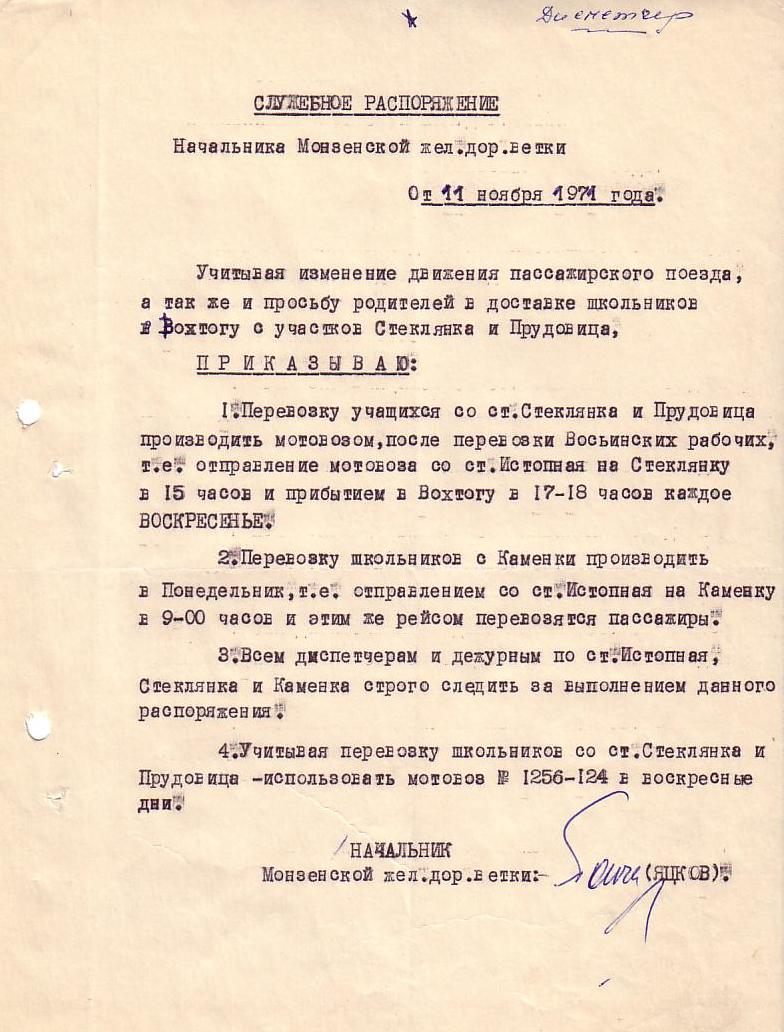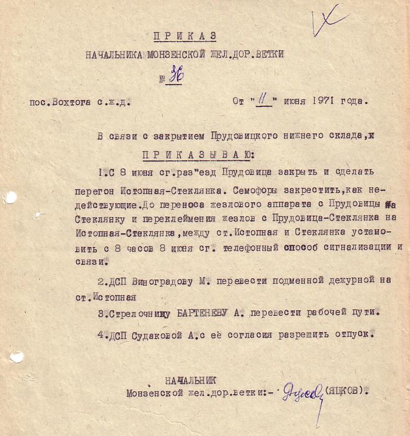 Приказ от 11 июня 1971 года (о закрытии разъезда Прудовица).