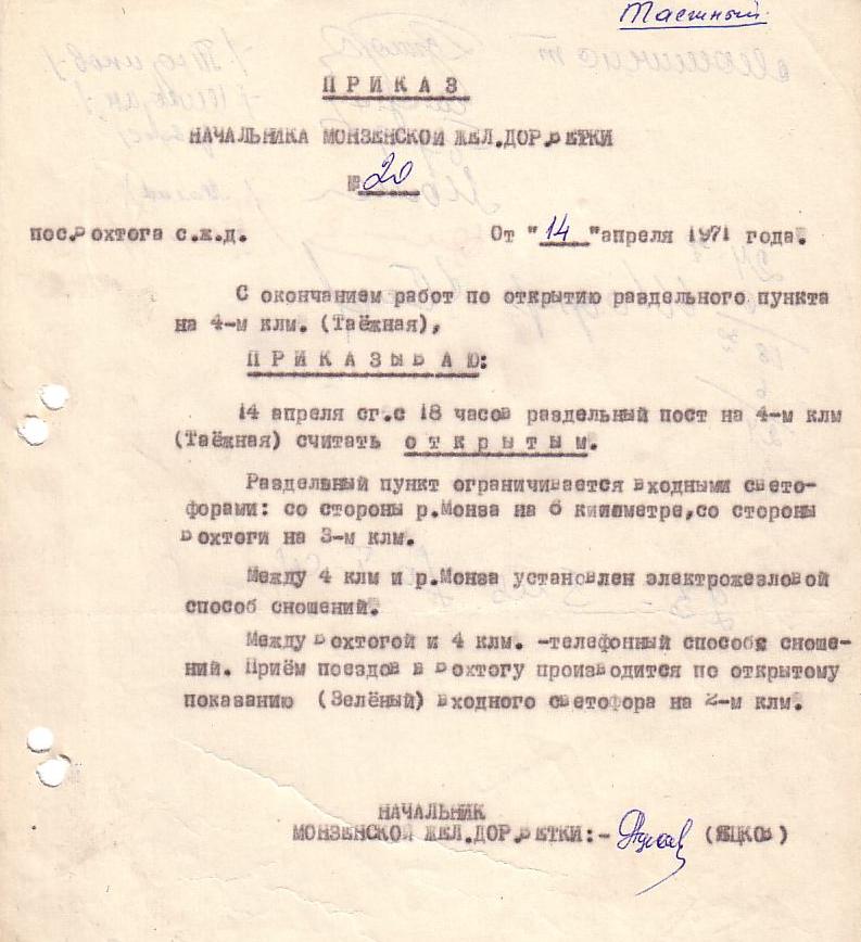 Приказ от 14 апреля 1971 года (о раздельном пункте на 4-м километре).