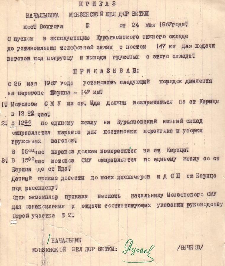 Приказ от 24 мая 1967 года (о порядке движения на перегоне Карица - 147 км).