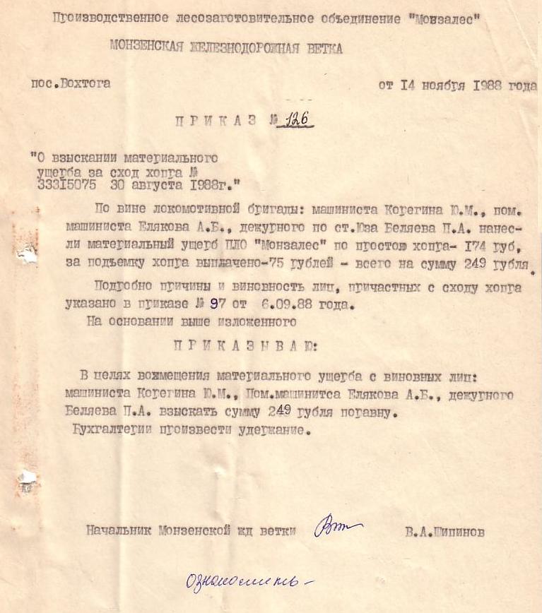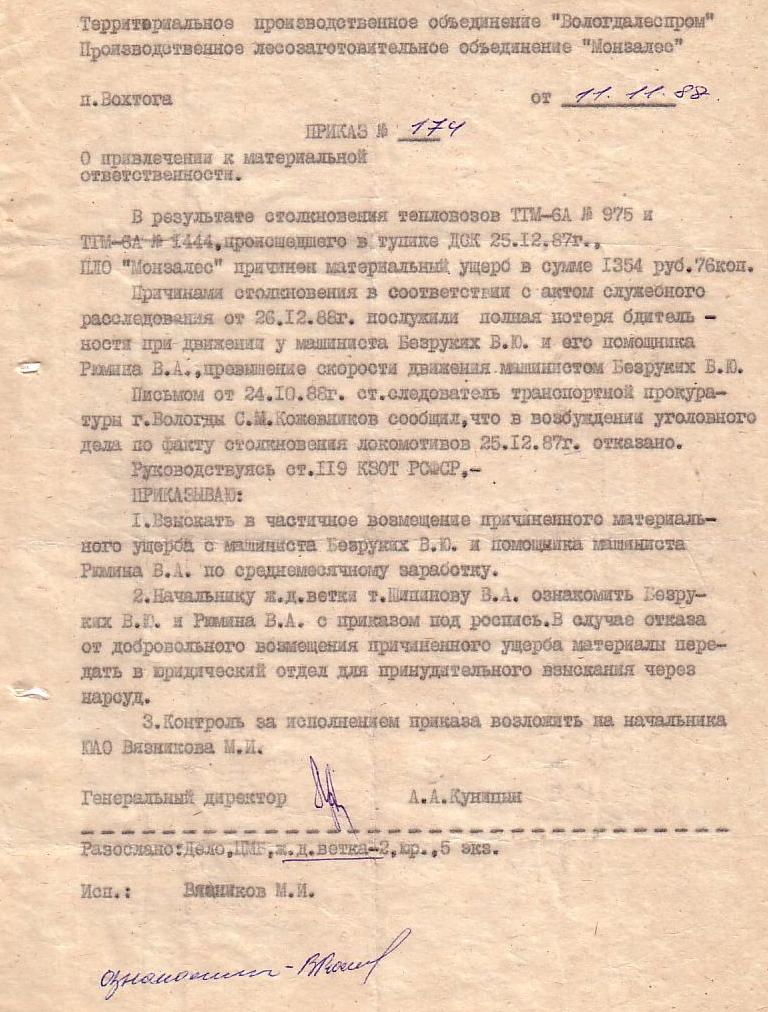 Приказ от 11 ноября 1988 года (о привлечении к материальной ответственности виновных в столкновении).