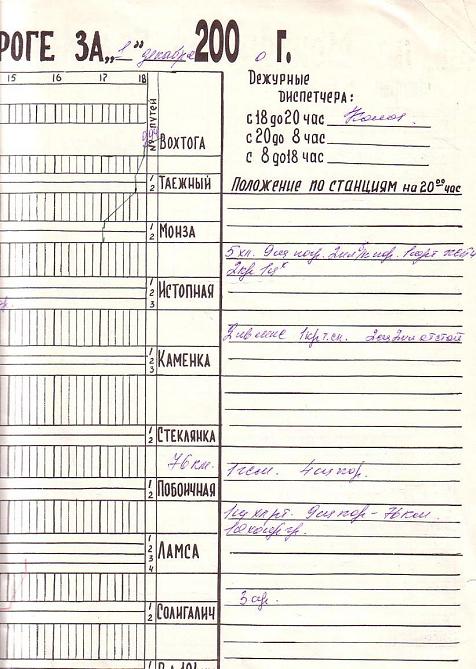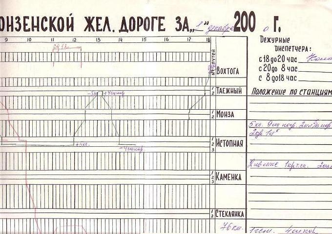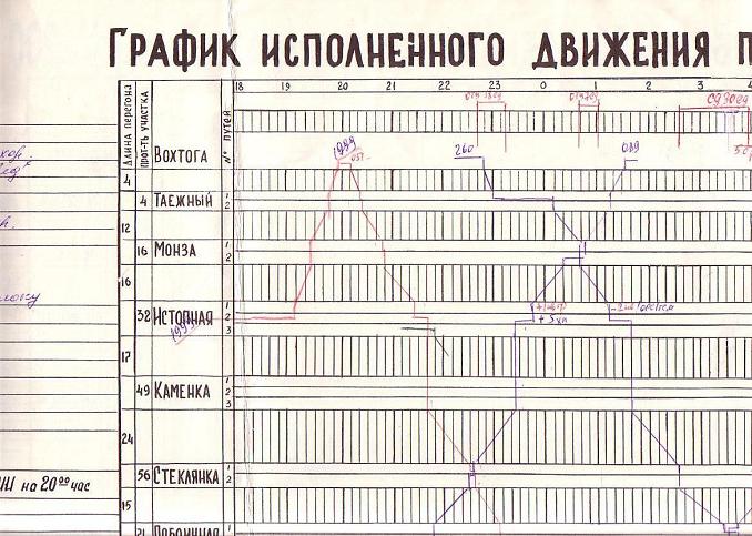 Фрагмент графика исполненного движения поездов Монзенской железной дороги за 1 декабря 2000 года.