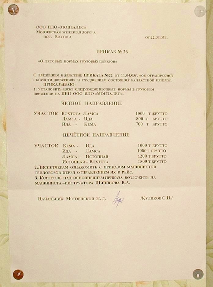 Приказ №26 «О весовых нормах грузовых поездов». Изображение сделано в 2005 году на станции Ламса.