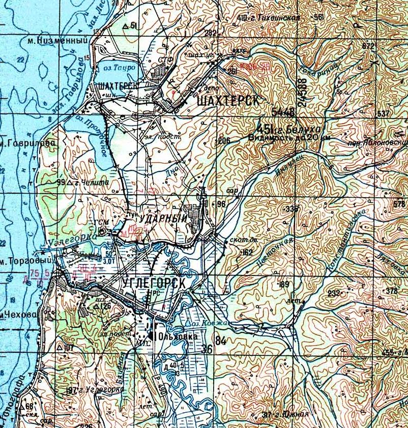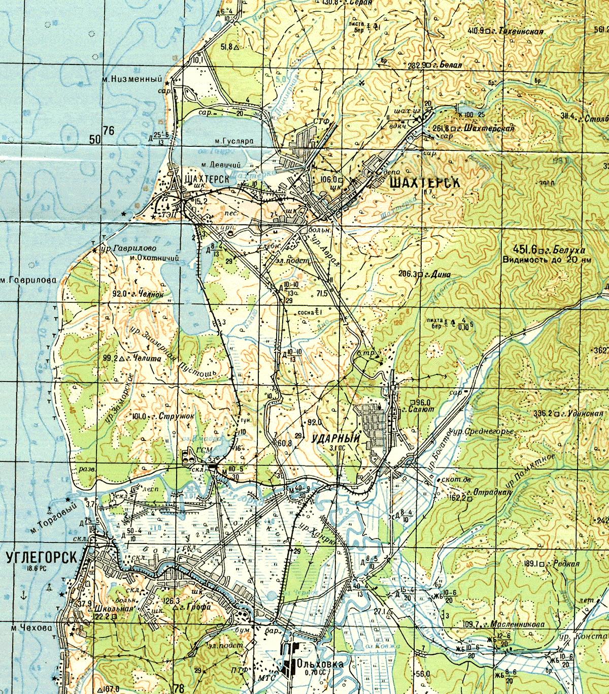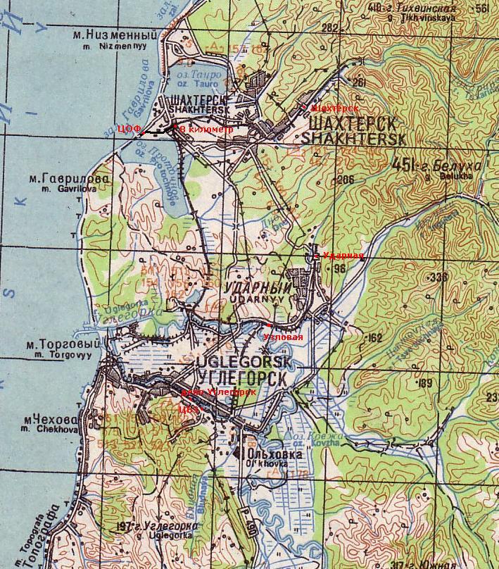 Узкоколейные железные дороги вблизи Шахтёрска и Углегорска на карте масштаба 1:250 000,