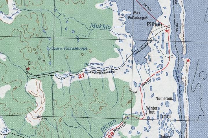Узкоколейные железные дороги вблизи Охи на карте масштаба 1:250 000, изданной в США в 1953 году.