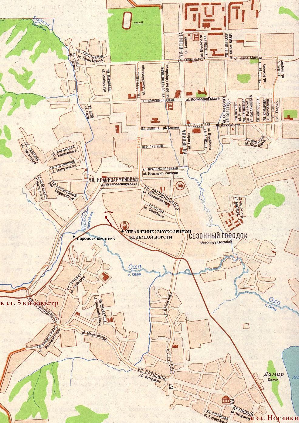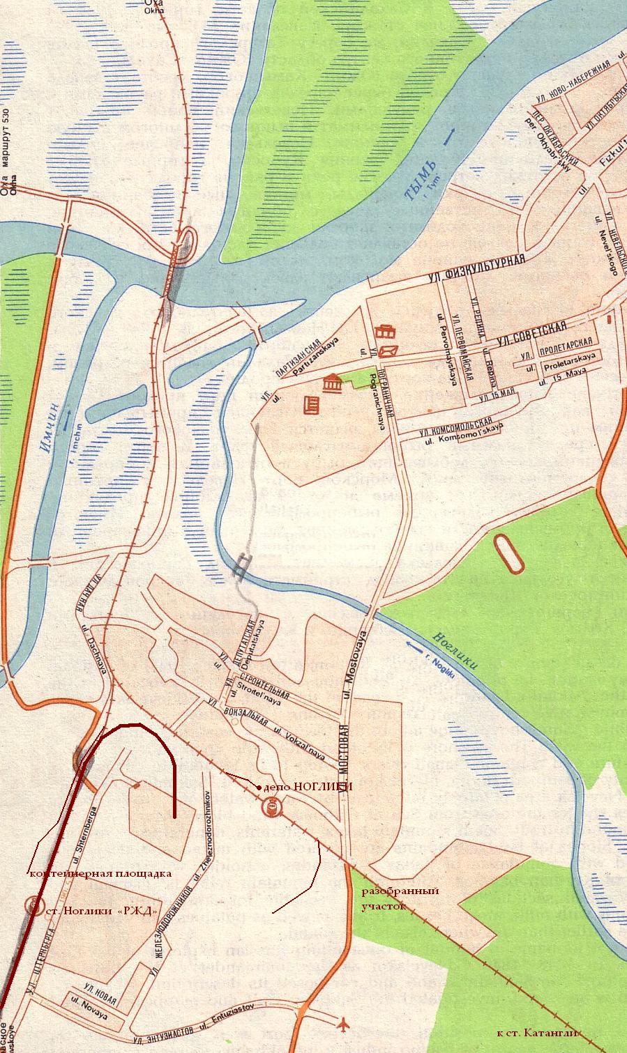 Линия узкоколейной железной дороги на плане посёлка Ноглики (состояние местности ориентировочно на 1992 год).