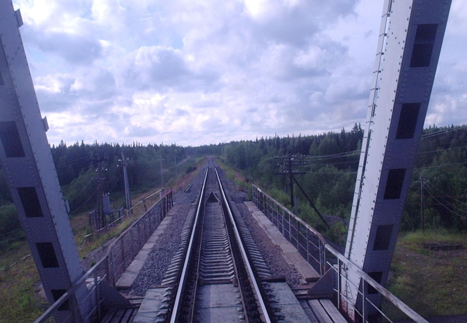 Первый мост через реку Пинега остаётся позади. Вид в сторону Архангельска. Слева можно заметить насыпь,