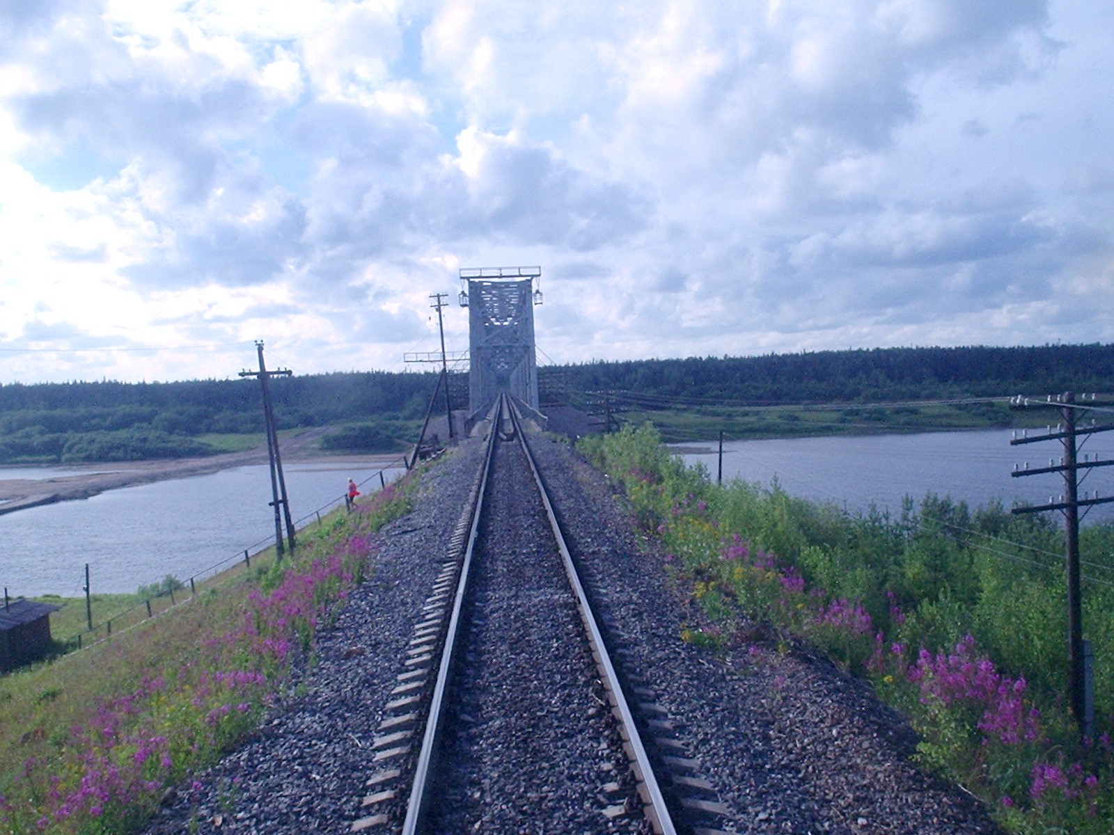 Железнодорожная линия вступает на первый мост через реку Пинега. Вид в сторону Архангельска.