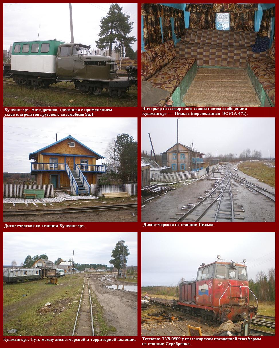 Узкоколейная железная дорога, по состоянию на середину октября 2008 года, состояла из лини Кушмангорт — Пильва Серебрянка и далее до границы с республикой Коми. Расстояние от крайнего южного пункта (Кушмангорта) до крайнего северного пункта составляло около 120 километров. Сохранялась одна «боковая» ветка длиной около 14 км. Линия на Зёрна и далее была полностью разобрана, протяжённость дороги в последние годы сократилась почти вдвое. Предполагалось, что уже через несколько месяцев конечным пунктом станет Пильва.