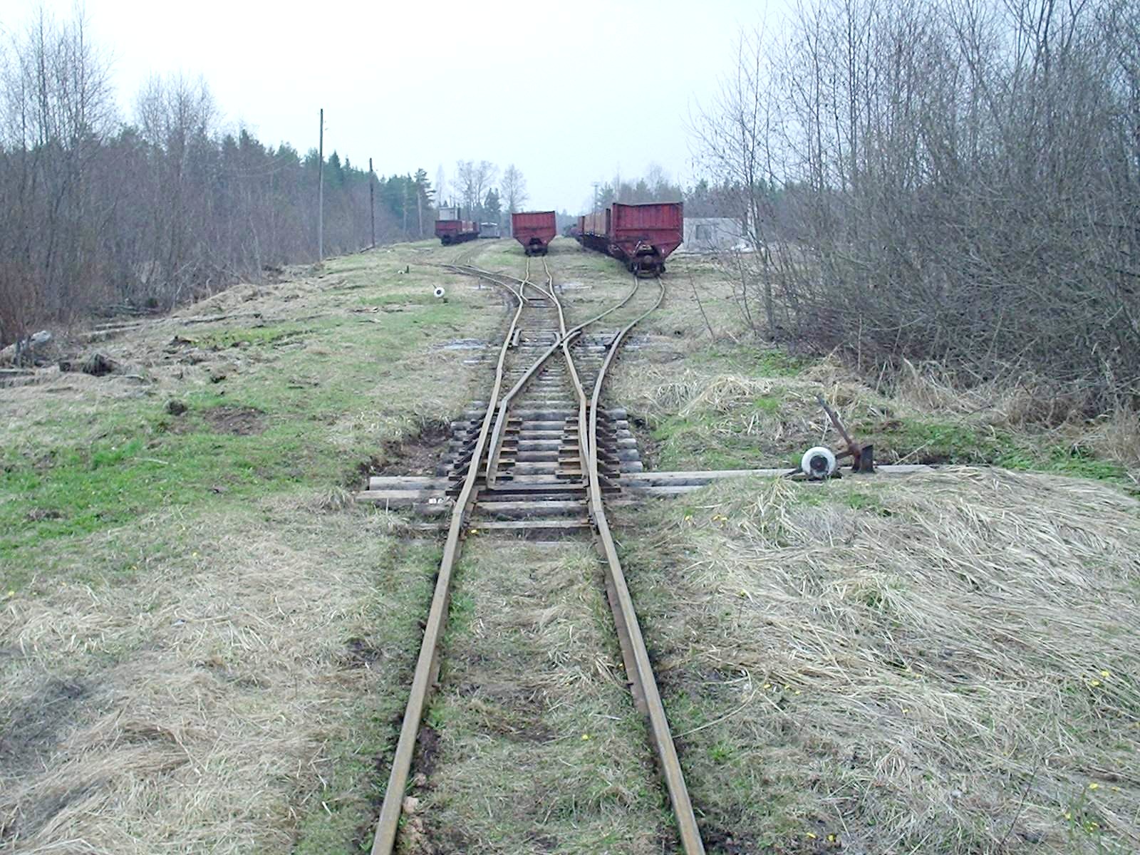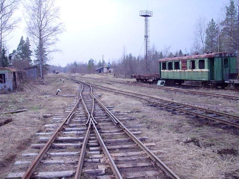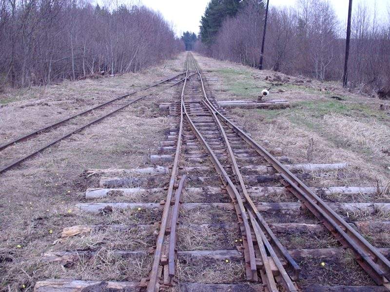 Разобранный путь широкой колеи приближается к действующим путям (станция Ранцево, «РЖД», Октябрьская железная дорога).