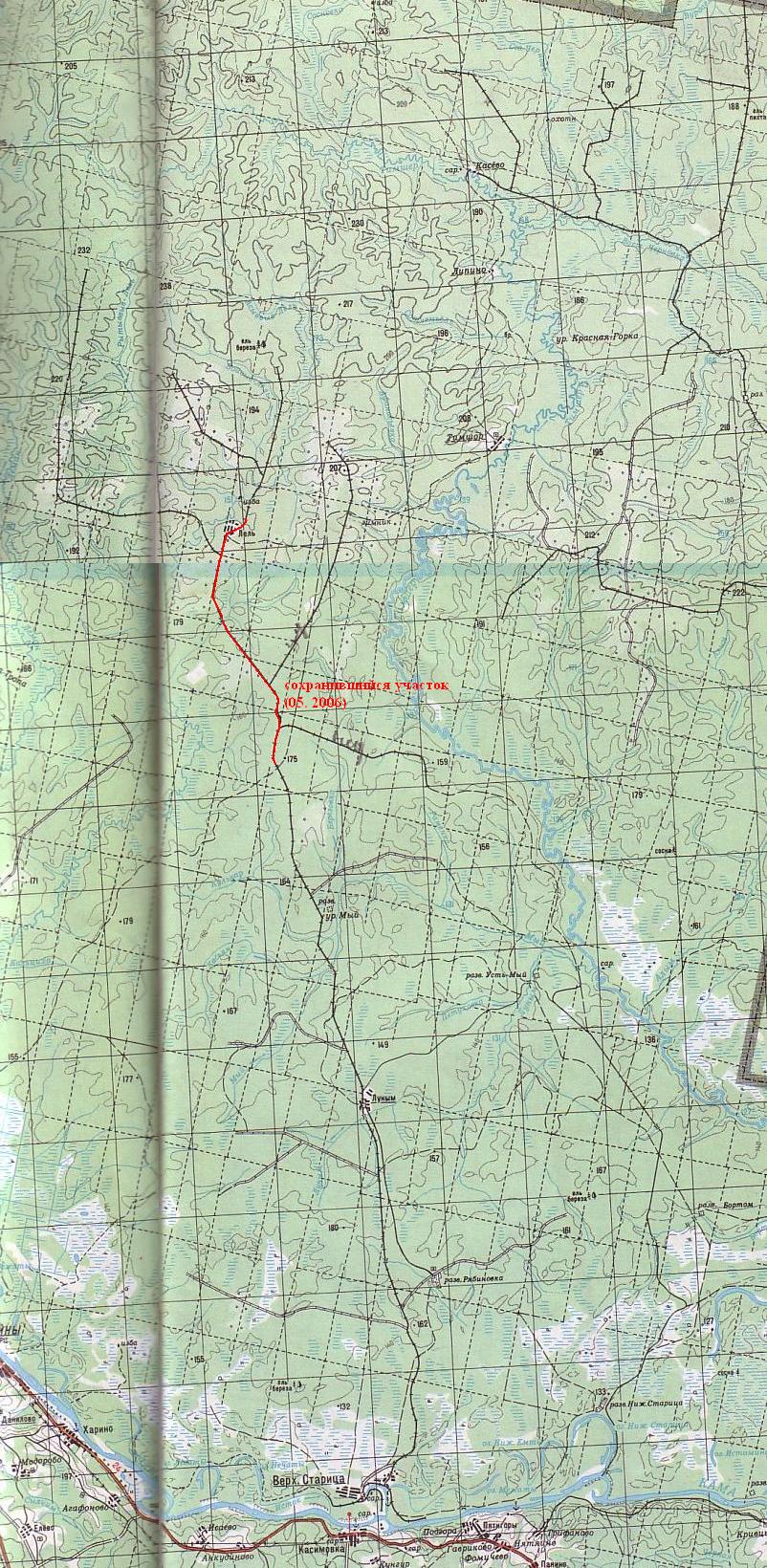 Узкоколейная железная дорога на топографической карте масштаба 1:100 000, изданной в 1998 году (северная часть), 199? году (южная часть).