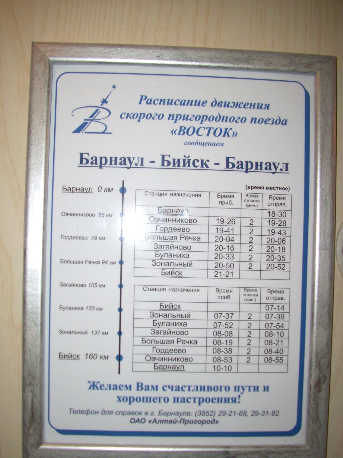 Расписание движения поезда «Восток», вывешенное в вагоне.