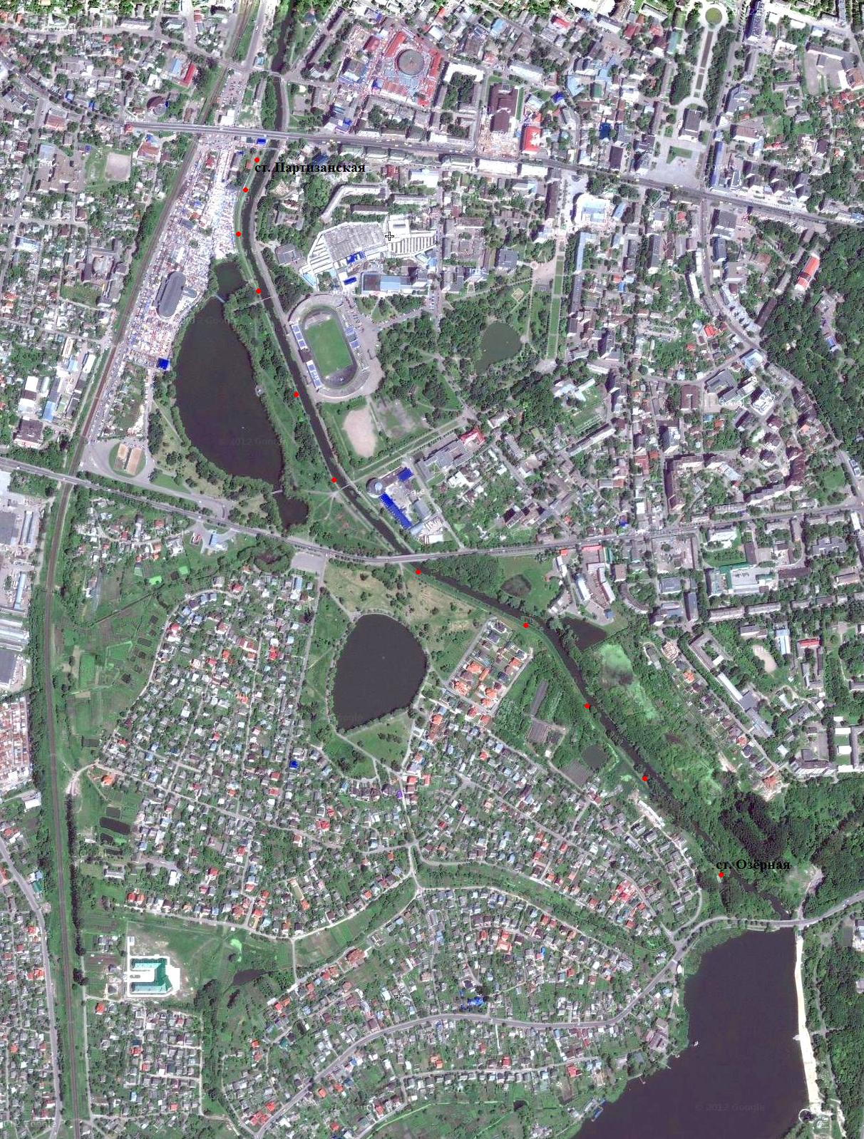 Ровенская детская железная дорога на спутниковом снимке (источник — «Google Maps», дата съёмки — 2010 год).