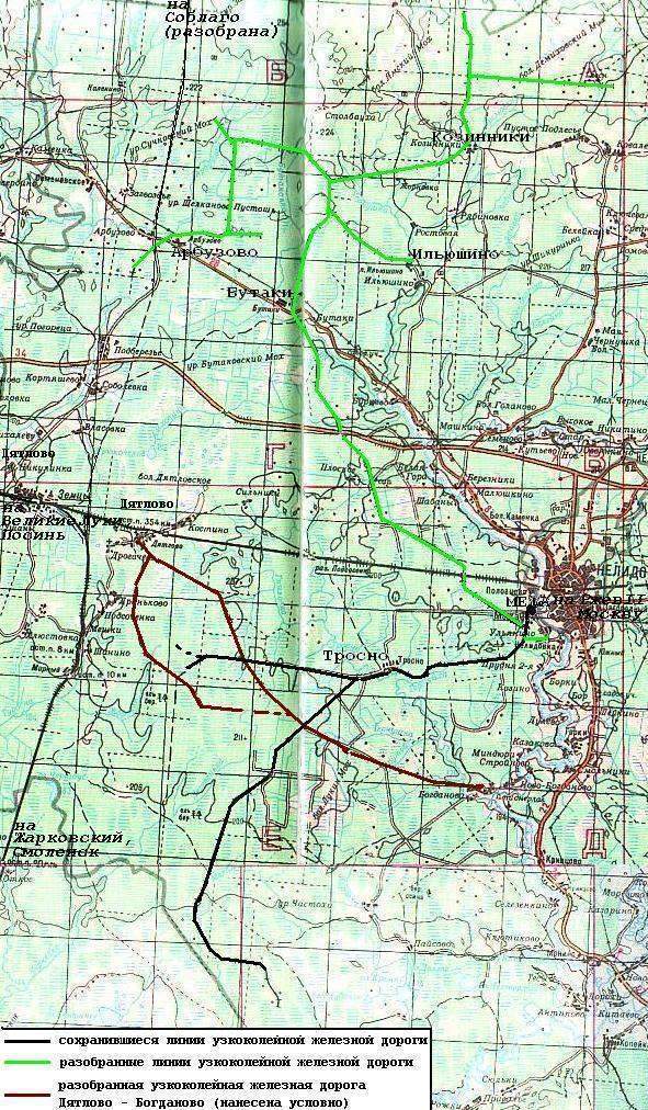 К северо-западу от города Нелидово в 1930-е годы действовали небольшие изолированные лесовозные узкоколейные железные дороги в посёлках Калекино и Арбузово (они относились к Западно-Двинскому леспромхозу), и в посёлке Бутаки. В Бутаках была короткая линия длиной 5 — 6 километров, на ней работал маломощный мотовоз. Лес подвозили к берегу реки Бутаковка. Весной, в период большой воды, он сплавлялся в Нелидово.