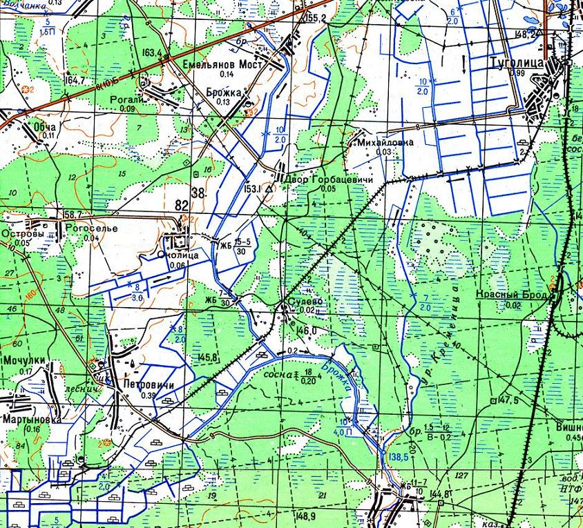 Узкоколейная железная дорога на топографической карте масштаба 1:100 000, изданной в 1982 году.