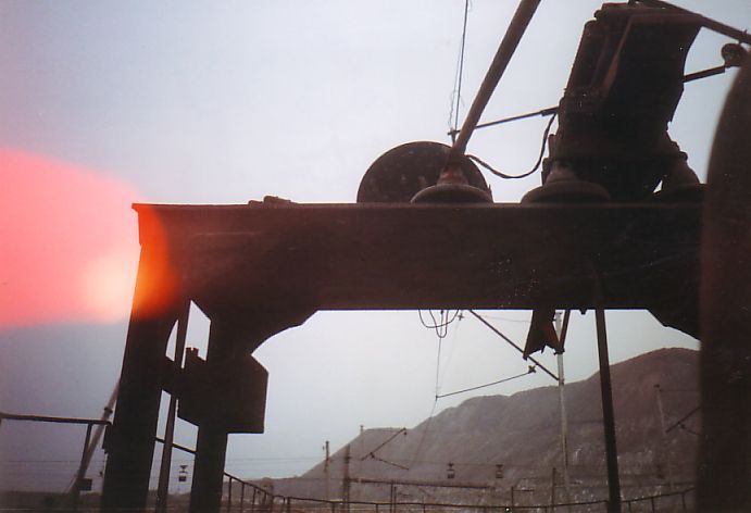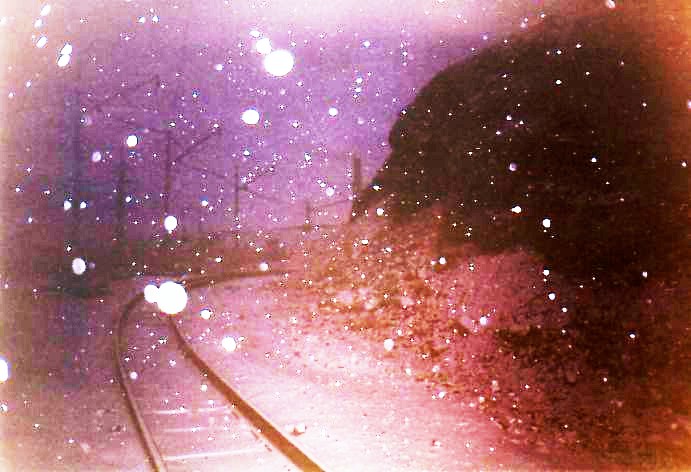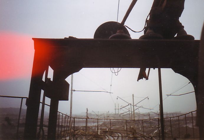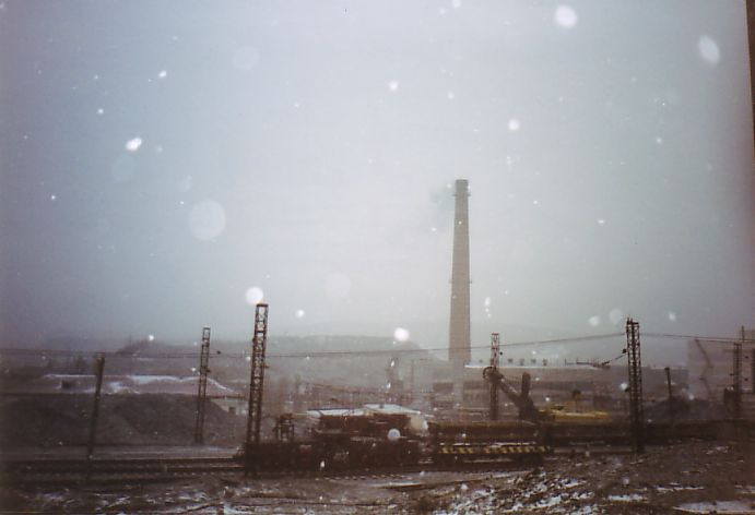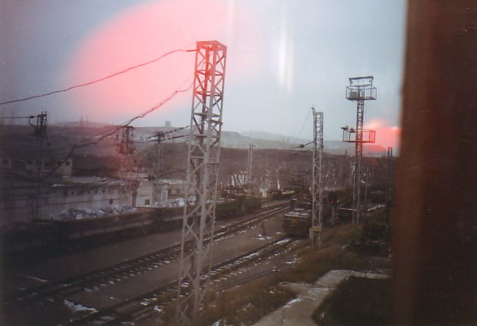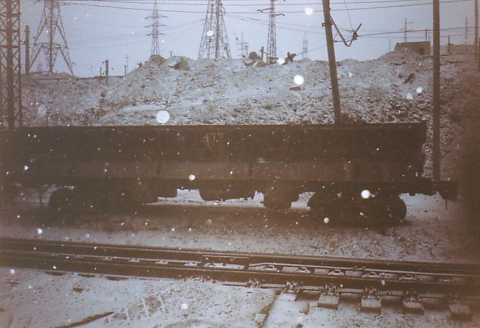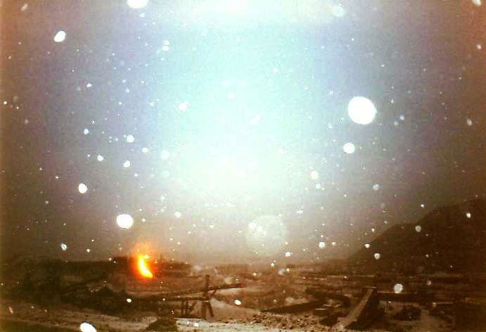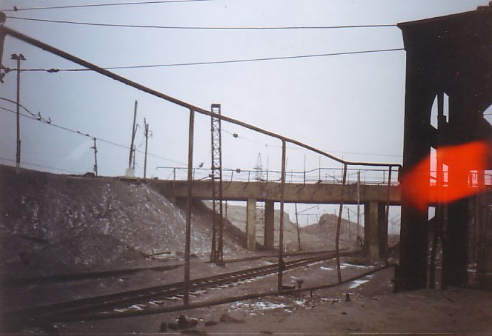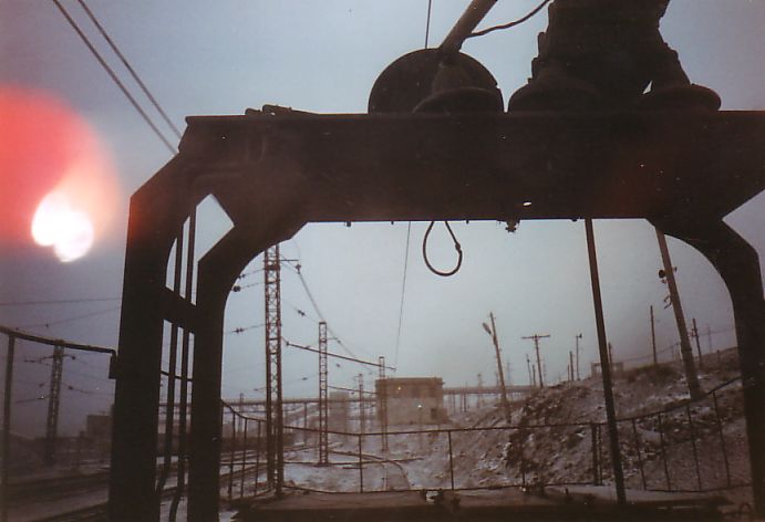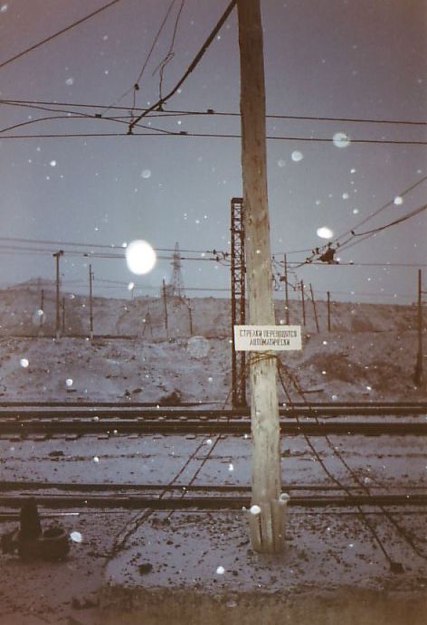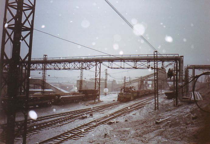 От станции ДОФ-2 проезжаю по временным путям. Пейзаж вокруг сюрреалистический; порой кажется, что находишься на другой планете в какой-то удалённой галактике. Сгустились сумерки, начался сильный снегопад. Эффект нереальности был дополнен гигантским багровым заревом на дальней горе. Там происходило сливание в отвал нескольких вагонов расплавленного шлака.