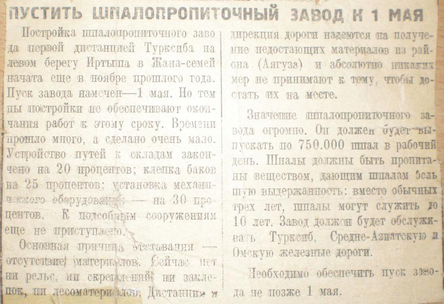 Заметка из семипалатинской газеты, посвящённая шпалопропиточному заводу.