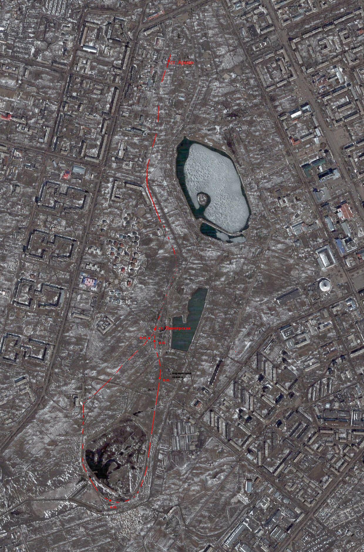 Карагандинская детская железная дорога на спутниковом снимке (источник — «Google Maps», ориентировочная дата съёмки — 2005 год).