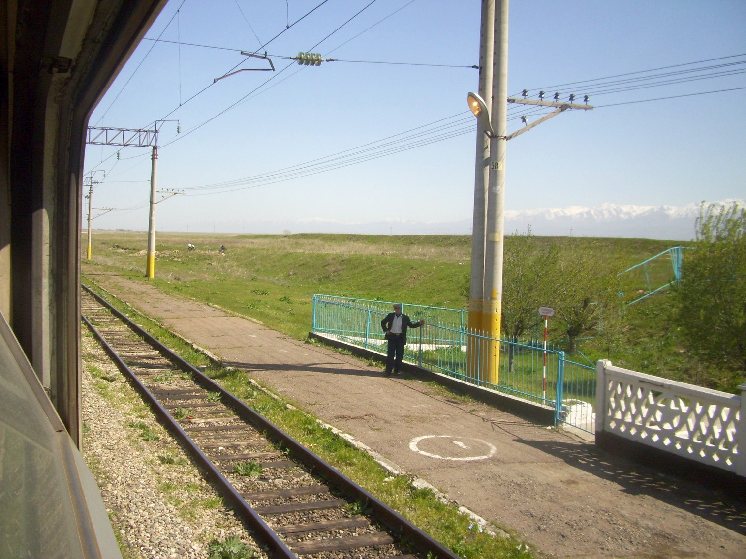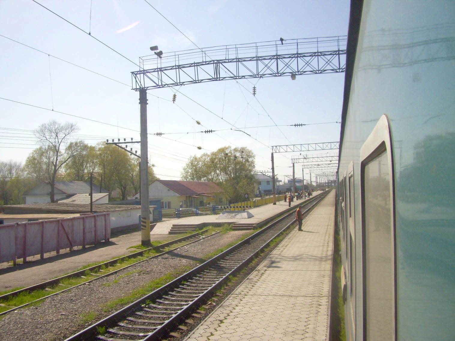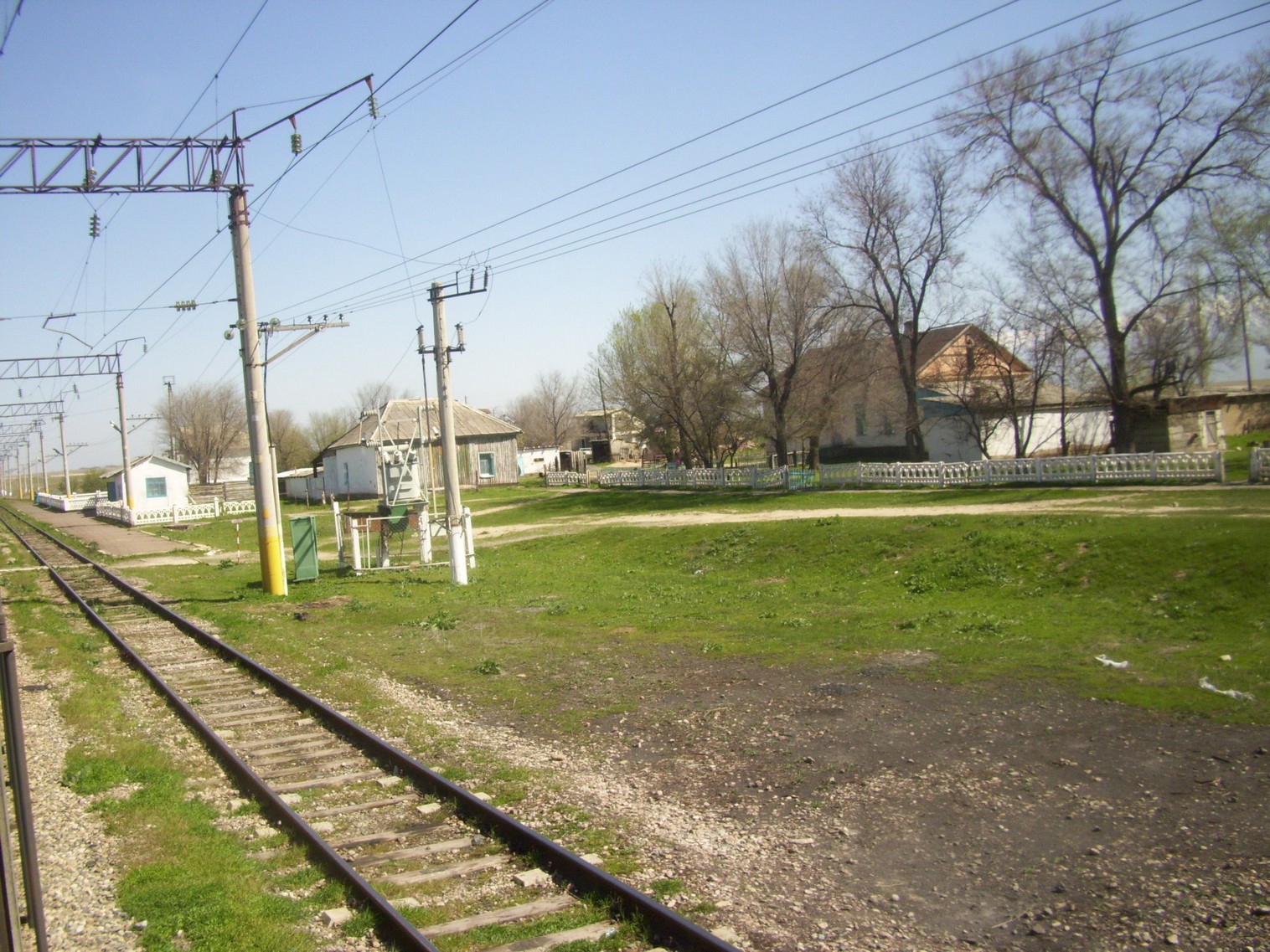 Впереди — станция Луговая. Вид из поезда сообщением Гурьев — Алма-Ата в северо-восточном направлении.