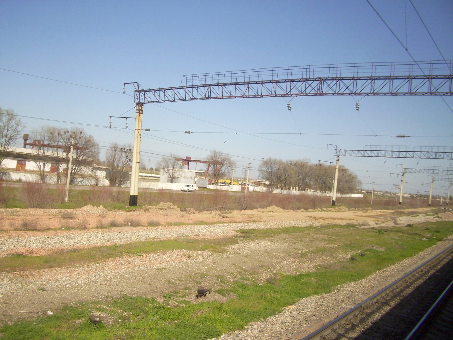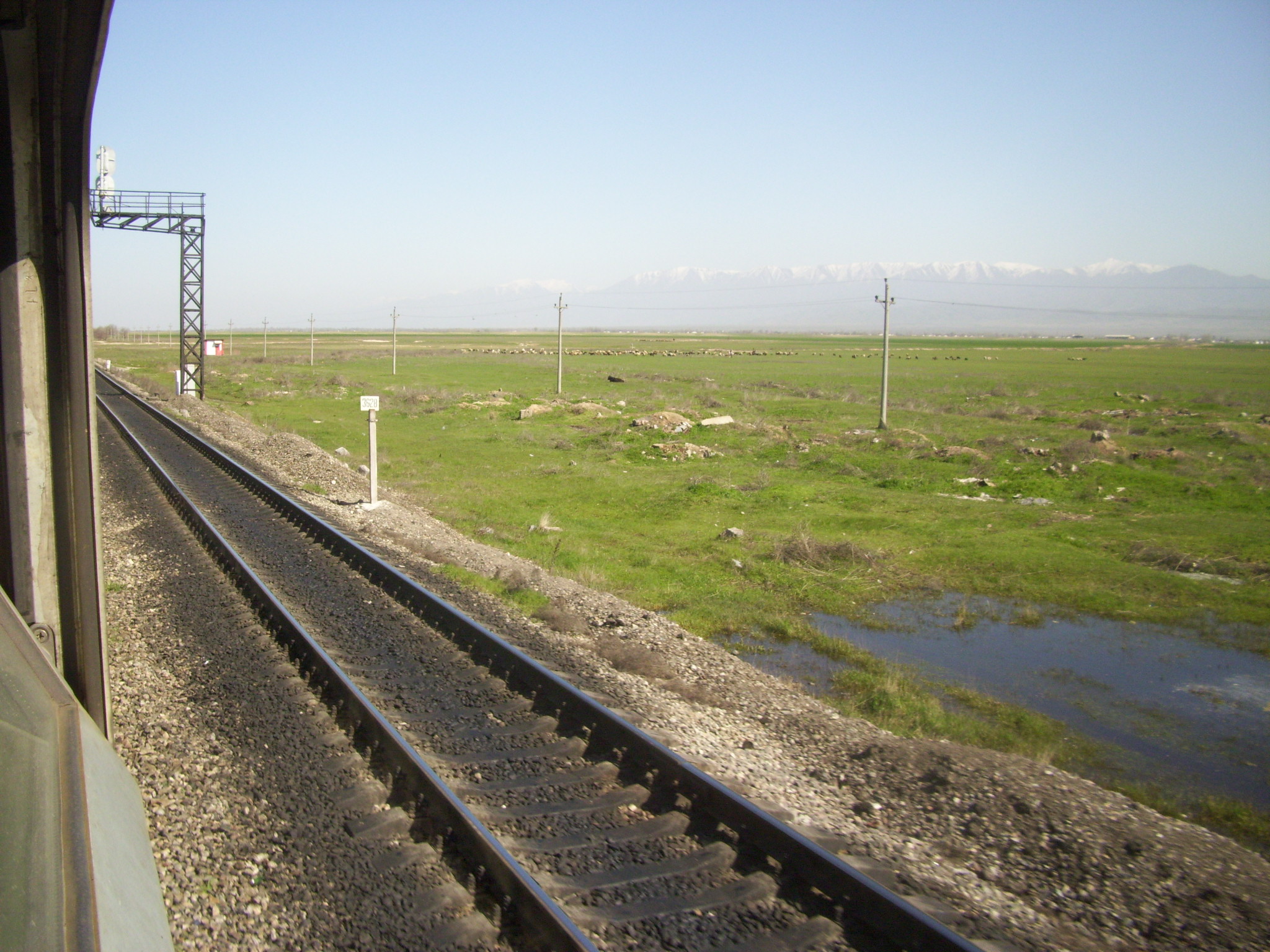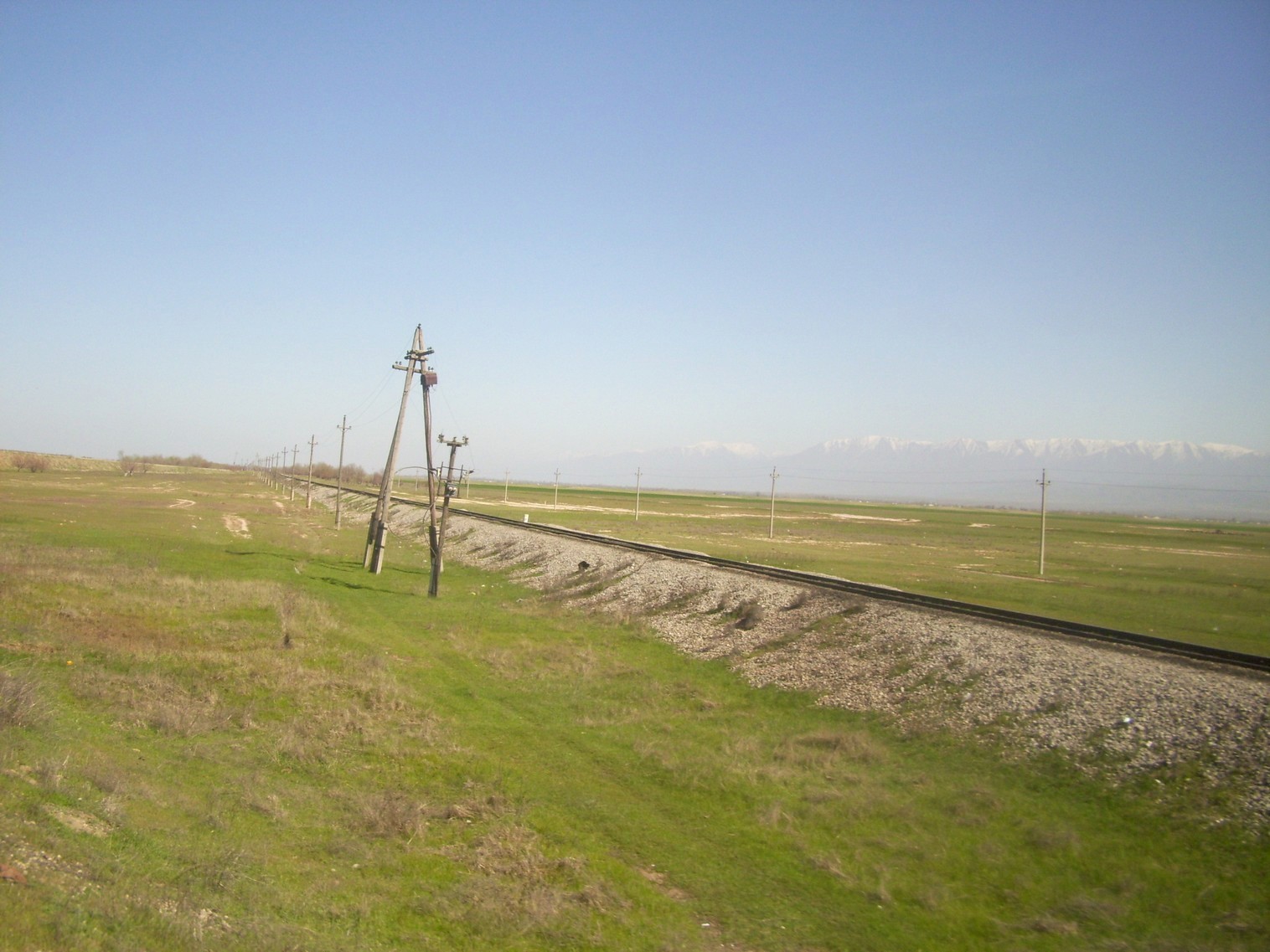 Впереди — станция Луговая. Вид из поезда сообщением Гурьев — Алма-Ата в северо-восточном направлении.