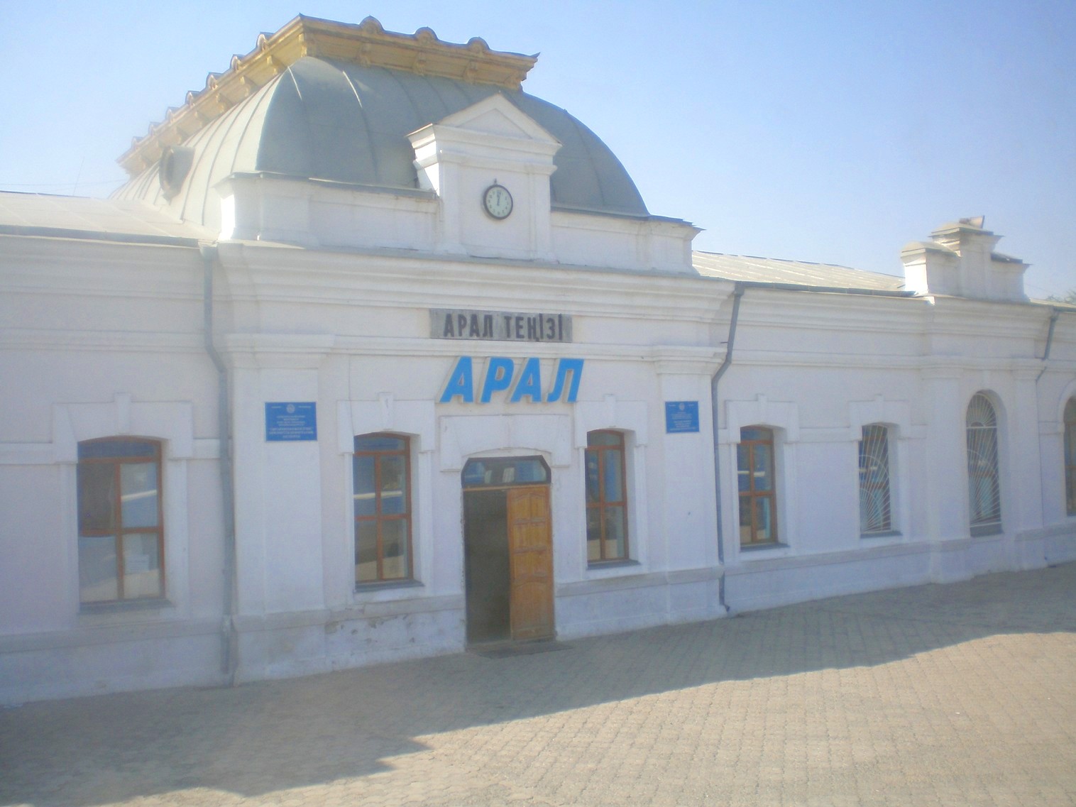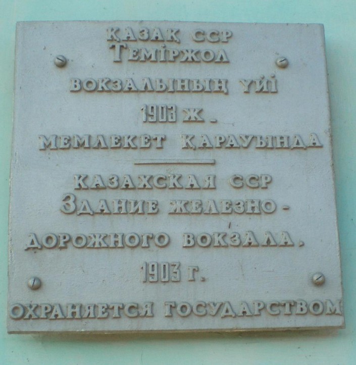 Мемориальная таблика на здании вокзала станции Казалинск (Казалы).