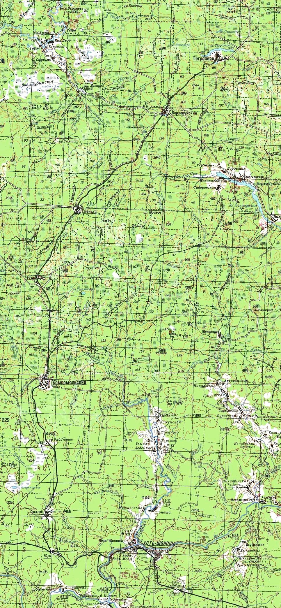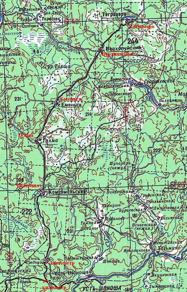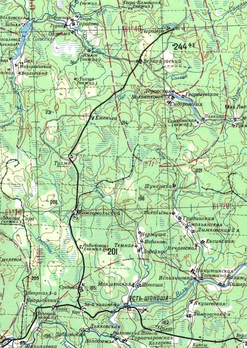Шоношская железная дорога на топографической карте масштаба 1:500 000, изданной в 1978 году.