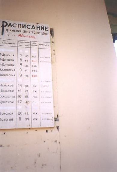 Расписание движения электропоездов, вывешенное у кассы