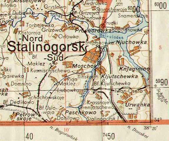 Железнодорожные линии вблизи Сталиногорска на топографической карте масштаба 1:100 000, изданной в 1941 году.