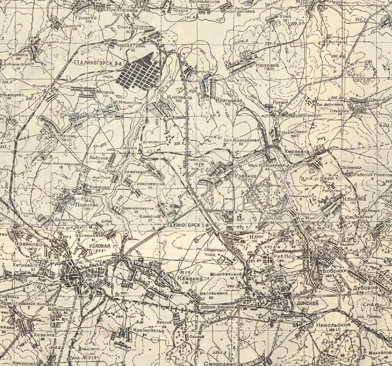 Железнодорожные линии вблизи Сталиногорска на топографической карте масштаба 1:300 000,