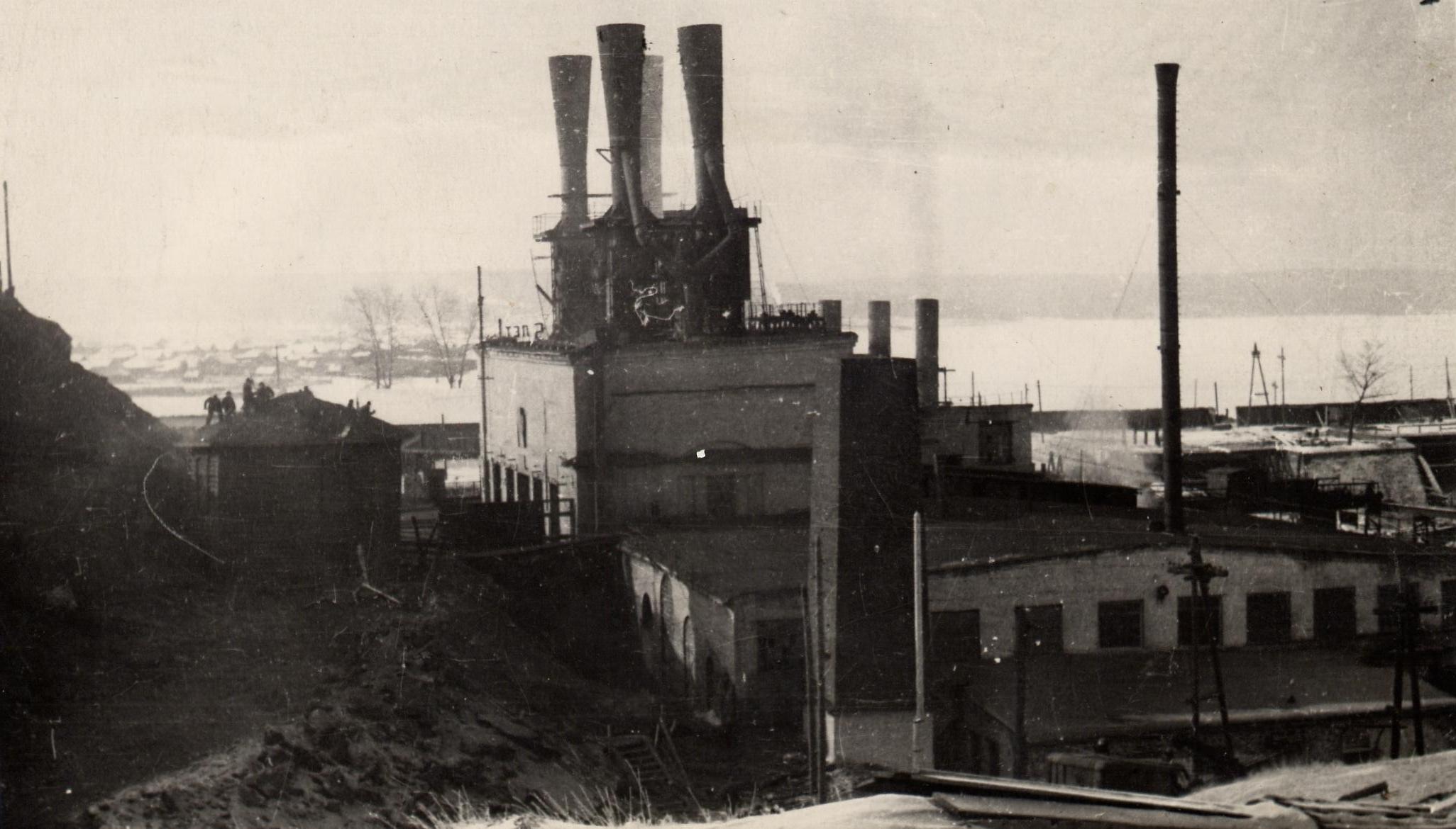 «Общий вид старого плавильного цеха с пылеулавливающими установками шахтных печей». Предположительно 1940-е годы.