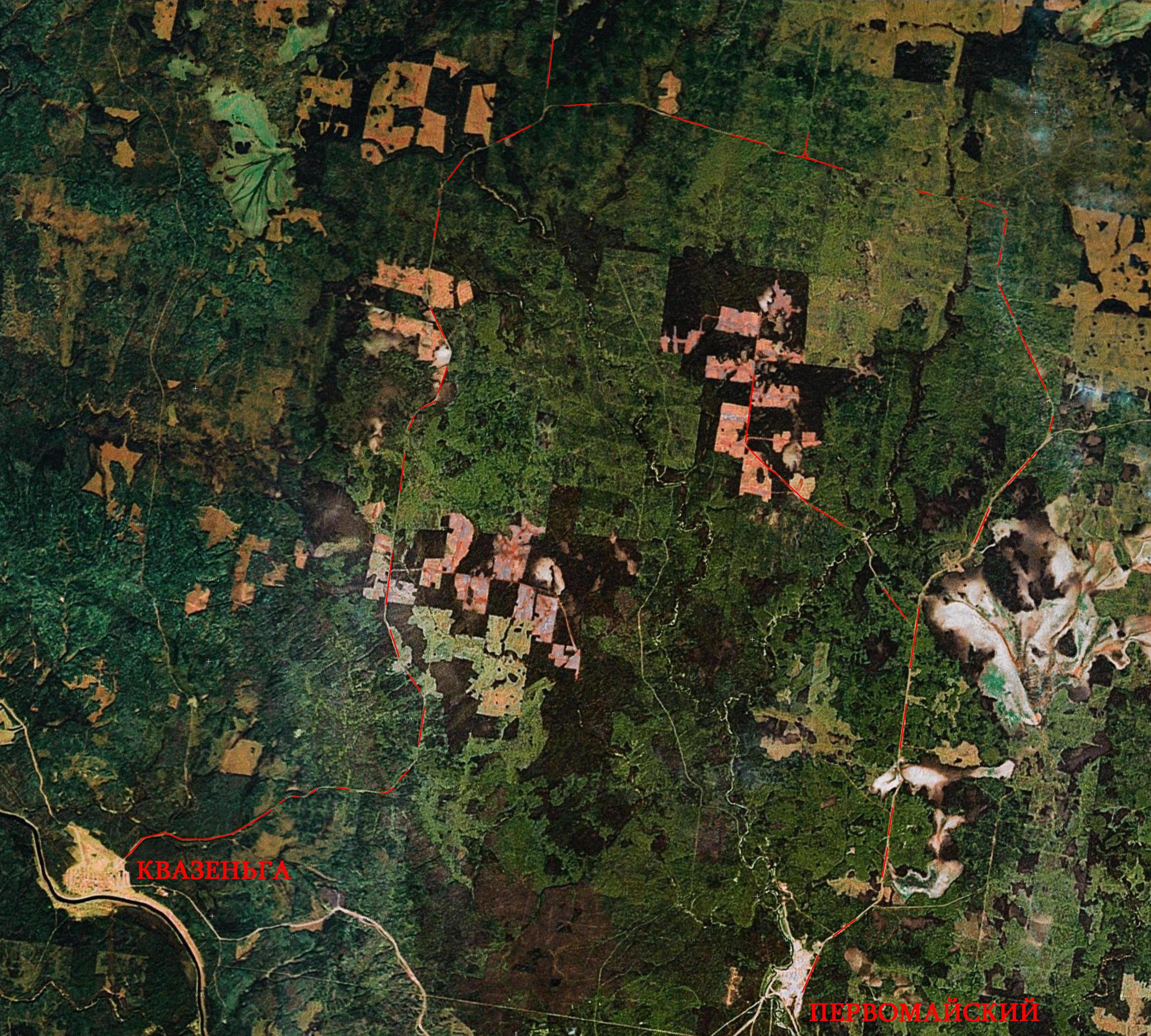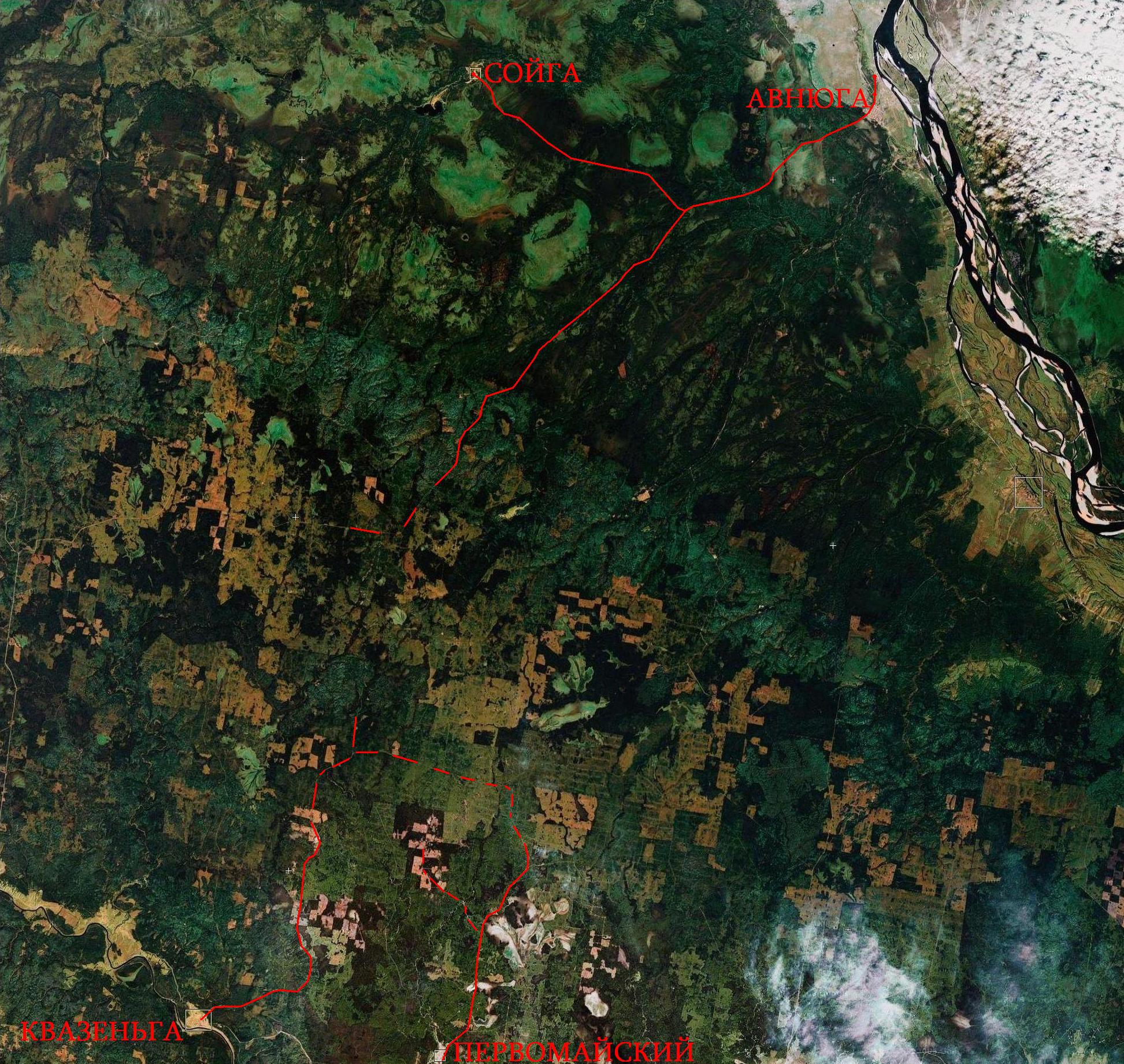 Квазеньгская, Бритвинская и Авнюгская узкоколейные железные дороги на спутниковом снимке