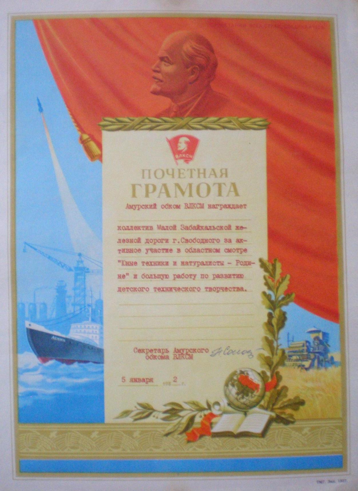 Почётная грамота коллективу Свободненской Малой Забайкальской детской железной дороги. 1982 год.