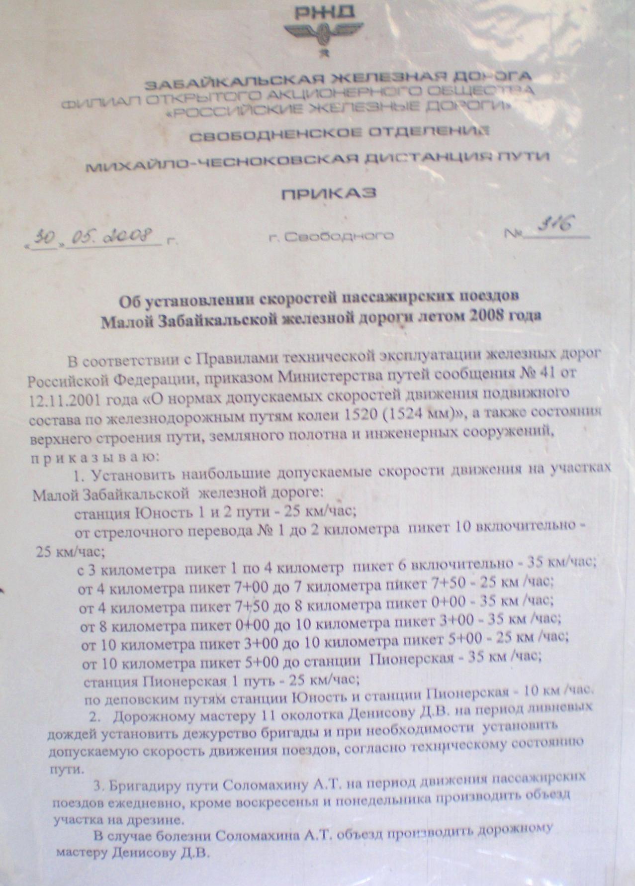 Приказ «Об установлении скоростей пассажирских поездов Малой Забайкальской железной дороги летом 2008 года».