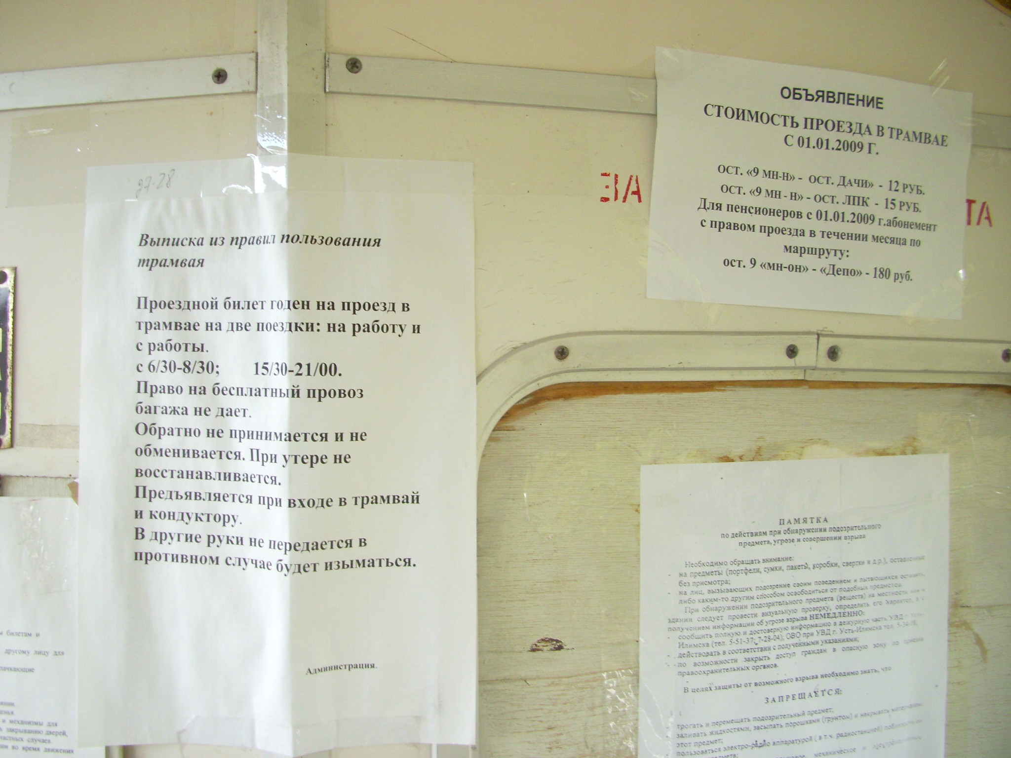 Объявления в салоне вагона с «бортовым» номером 014, касающиеся стоимости проезда.