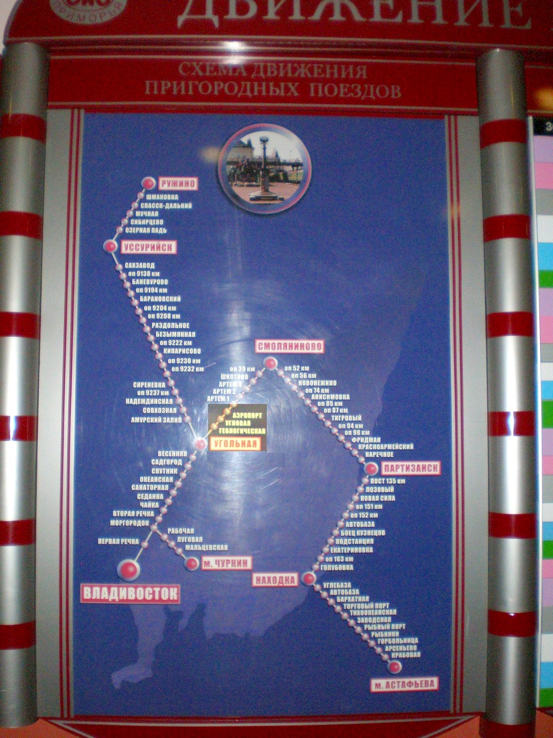 Схема движения пригородных поездов, вывешенная на вокзале станции Владивосток.