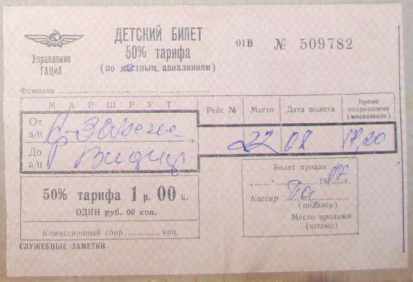 Билет Красное Заречье — Владимир, 1987 год. Перелёты по маршруту Владимир — Красное Заречье и обратно (с кратковременной промежуточной посадкой в Бухолово) совершались неоднократно в 1987 году, а также в последующие годы (предположительно 1988 и 1989). Можно предположить, что было совершено не менее четырёх перелётов.