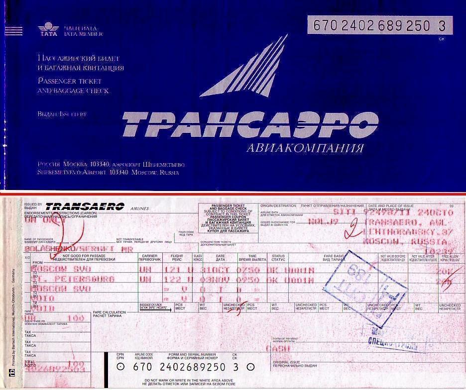 Билет Москва — Санкт-Петербург — Москва и посадочный талон. Билет Москва — Санкт-Петербург — Москва был куплен по «спецпредложению» авиакомпании за 100 рублей (приблизительно 6 USD), что было примерно в 10 меньше нормальной цены.