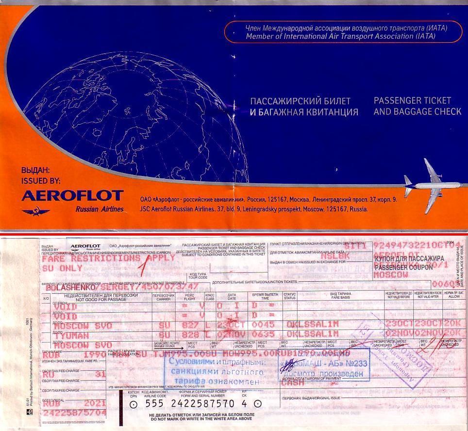Билет Москва — Тюмень — Москва. Билет Москва — Тюмень — Москва был куплен по «спецпредложению» авиакомпании «Аэрофлот», обошёлся существенно дешевле стандартного тарифа.