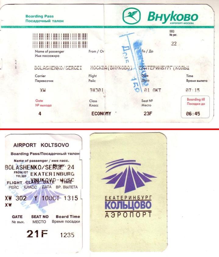 Посадочные талоны Москва — Екатеринбург и Екатеринбург — Москва. Рейс 1 октября 2007 года —
