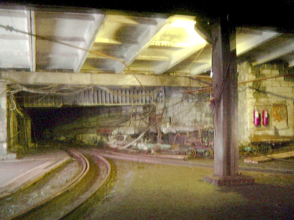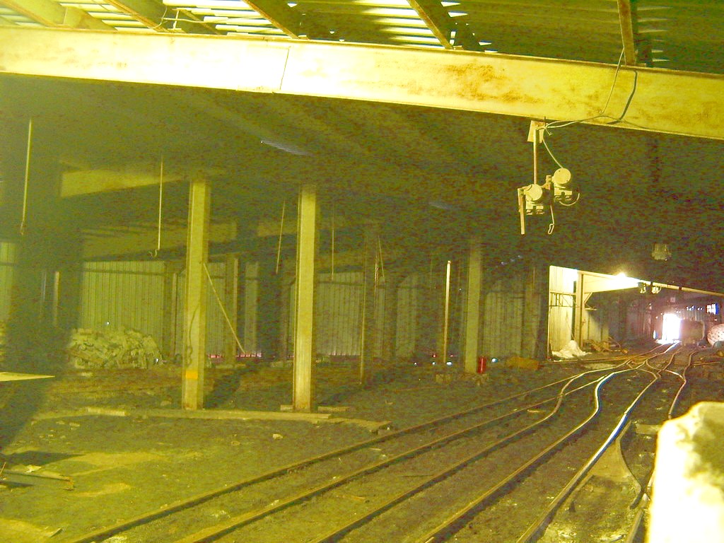 «Вокзал». Вид направо от выезда из шахты. Маневровые пути. На заднем плане – стена депо (с воротами).