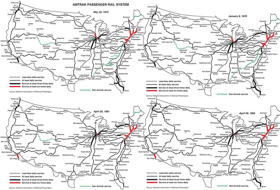 На приведённой схеме пассажирского сообщения США и Канады есть линии, которые отсутствовали в её оригинальном виде: Бостон — Портленд, Петерсбург — Норфолк, Sept Iles — Schefferville.
