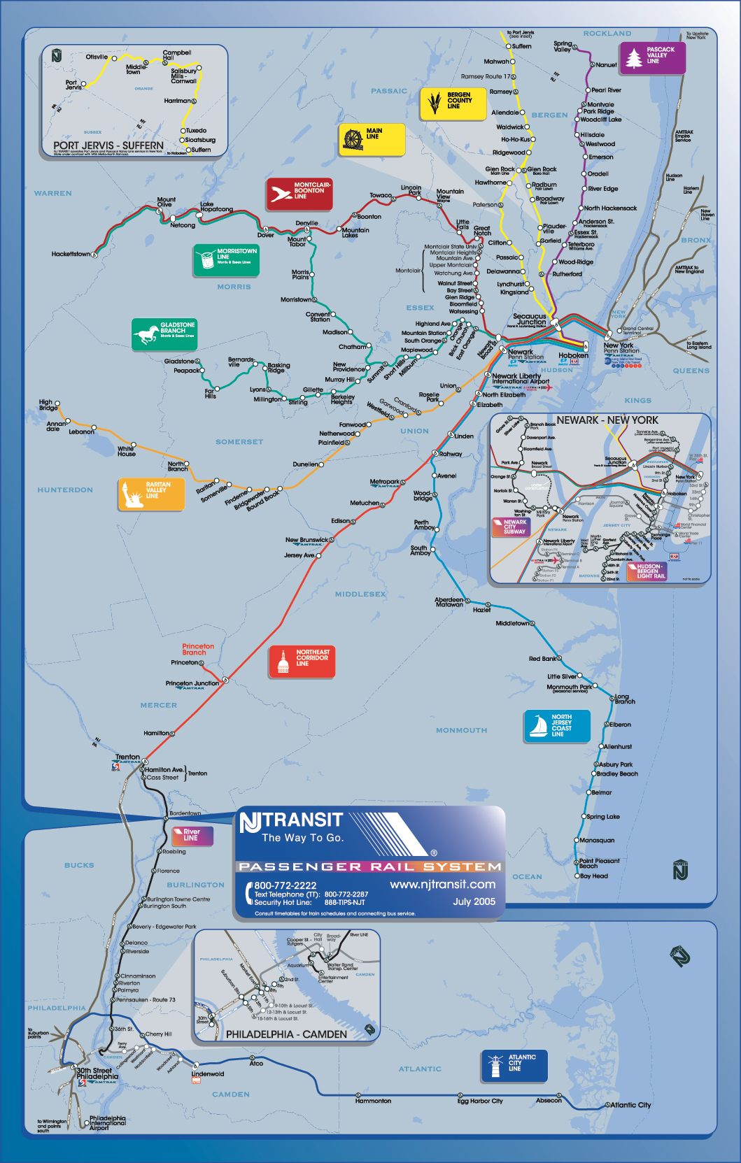 Схема движения пригородных поездов на юг, запад и север от Нью-Йорка. (Источник: http://www.njtransit.com/images/railmap05.jpg)