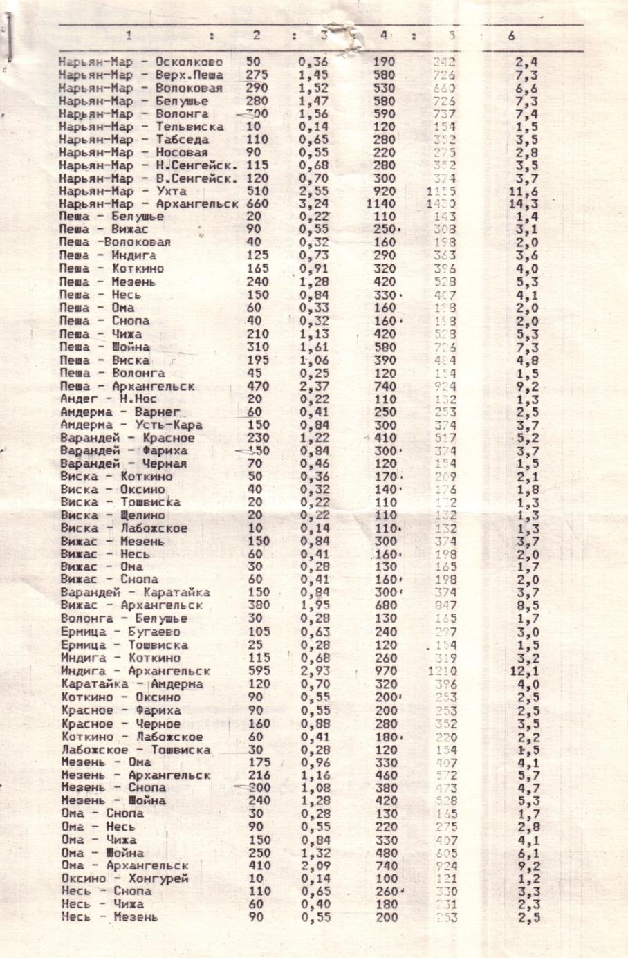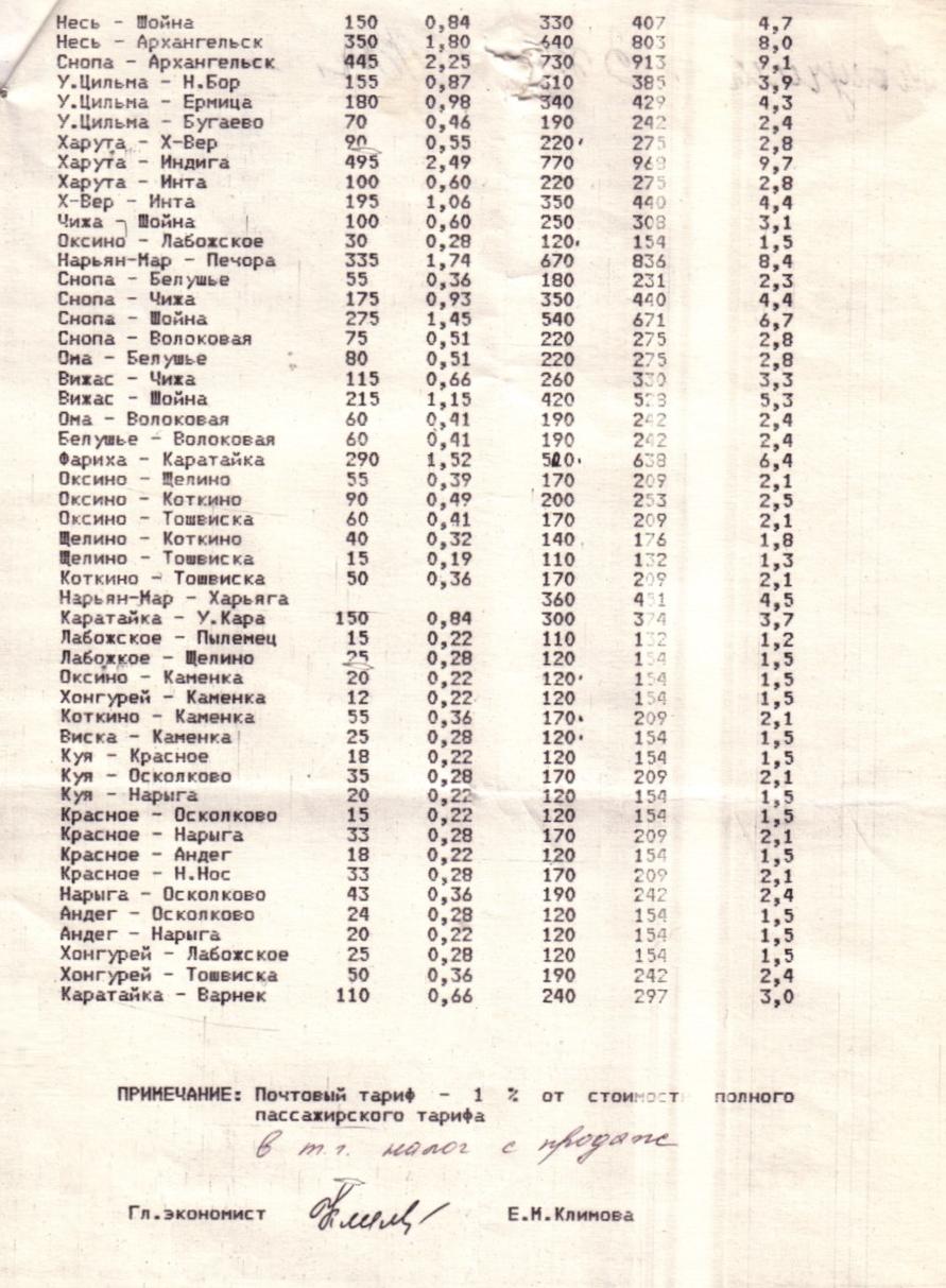 Тарифы Нарьян-Марского объединённого авиаотряда на авиаперевозки пассажиров, почты и грузов (1999 год). Регулярные рейсы выполнялись не на всех указанных маршрутах.