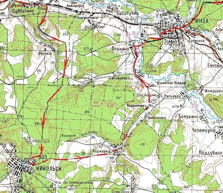 и пешего перехода от Никольска до Инзы на карте масштаба 1:200 000.