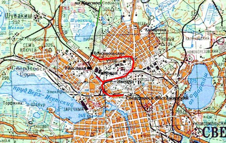 На окрестности Екатеринбурга у меня была карта масштаба 1:200 000 — в отличие от остальной Свердловской области. Также был подробный план города. Казалось бы, с таким картографическим обеспечением задача поиска пункта отправления поездов на Красное упрощается — однако ни на одной из карт не были обозначены станции на этой линии (кроме станции Садовая, но она далеко в лесу и не может являться начальным пунктом пассажирского движения).