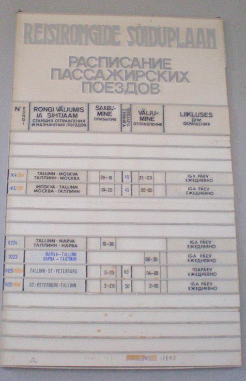 Расписание движения поездов — двуязычное. Вероятно, такие же расписания висели на всех станциях в Эстонской ССР. Теперь оно сохранилось только в Нарве.